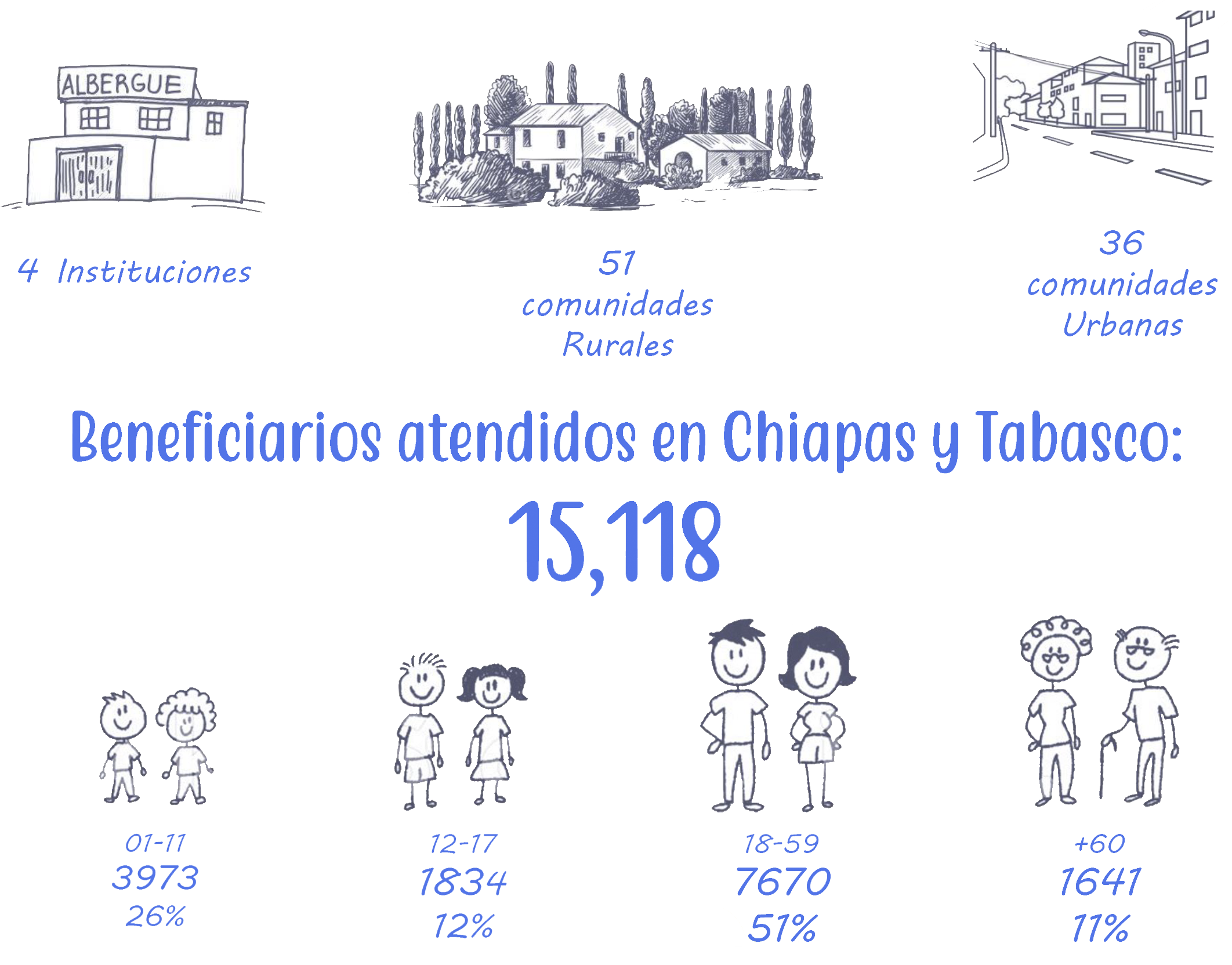 Banco de Alimentos del Soconusco, atiende a personas de escasos recursos en los municipios de Chiapas Tapachula, Huixtla, Tuzantán, Mazatán, Huehuetán, Escuintla, Cacahoatán, Metapa, Tuxtla Chico, Unión Juárez, Cd. Hidalgo y Arriaga, así como 4 comunidades del municipio de Paraíso, Tabasco; Nuevo Torno largo, Isla Santa Rosa, Isla Andrés García, José María Morelos y Pavón (El Bellote).
